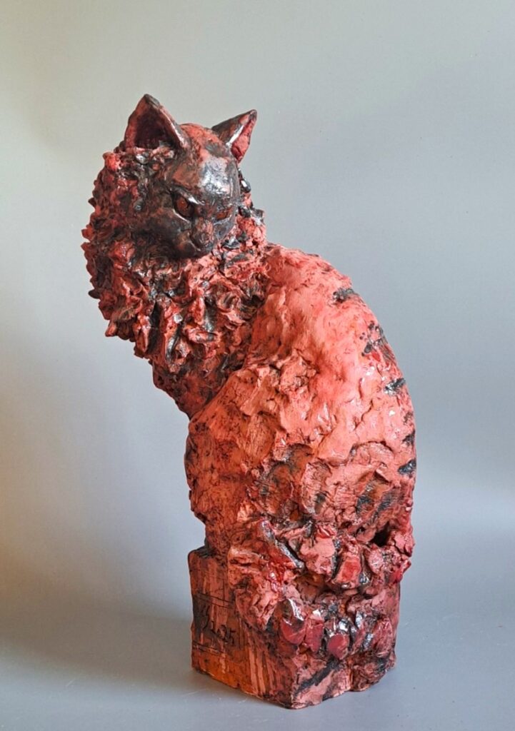 Rote Katze 2026, roter Ton, Engobe, Oxide, Höhe 50 cm