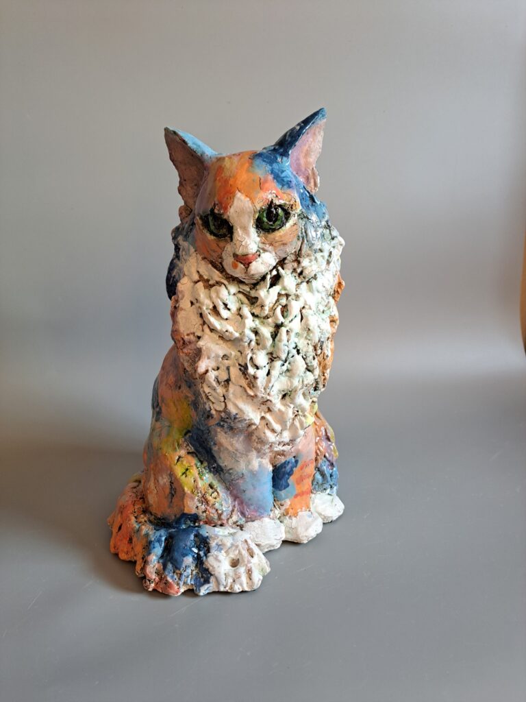 Bunte Katze 2025, Keramik, Engobe, Oxide, Glasur. Höhe 50 cmErdbeerliebe 2022 Keramik engobiert und glasiert auf Metallsockel Hoehe 49cm