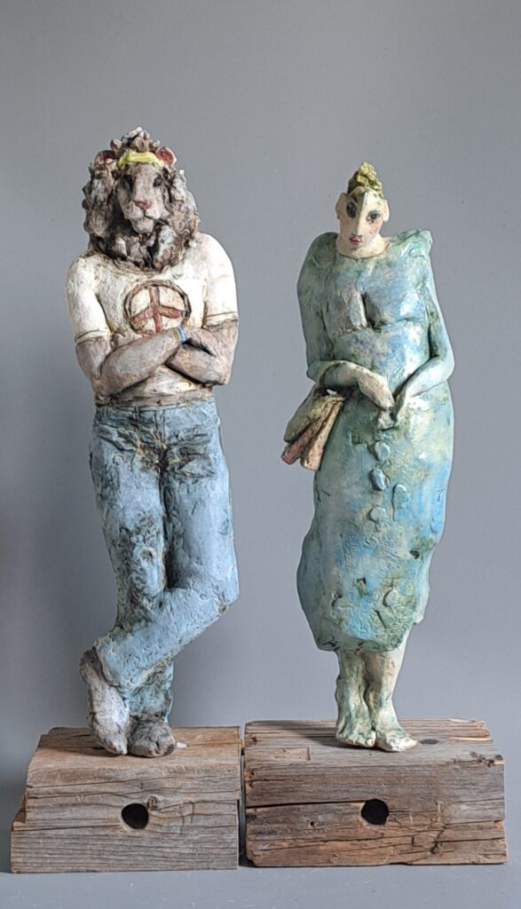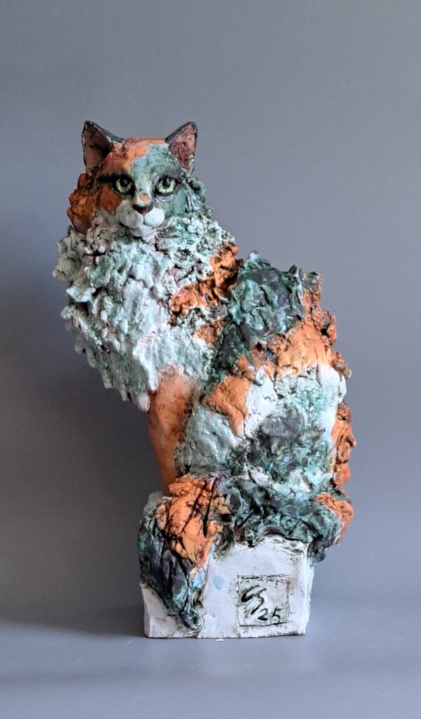 Langhaarkatze 2025 Keramik, Engobe, Glasur, Oxide Höhe 45 cmEngel an der Wand 2024 Wandobjekt Keramik, Engobe, Glasur, Oxide Höhe 36 cm , Breite 35 cmPeace please, die Wandernde 2024 Keramik, Engobe, Glasur, Oxide Höhe ca. 45 cm